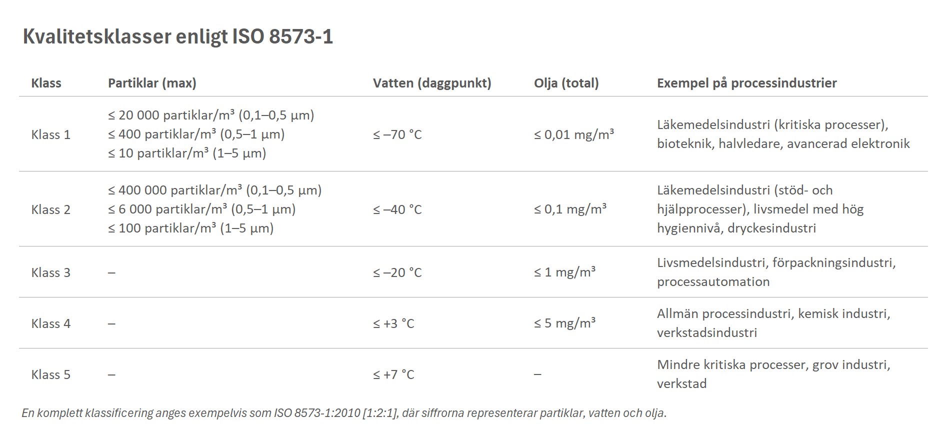 För att hantera dessa risker används den internationella standarden ISO 8573-1, som definierar renhetsklasser för tryckluft. Standarden specificerar tillåtna nivåer av partiklar, vatten (daggpunkt) och olja och används som gemensam referens vid kravställning, validering och revision. Att analysera tryckluft enligt ISO 8573-1 är därför en central del i kvalitets- och riskhanteringen inom modern processindustri.