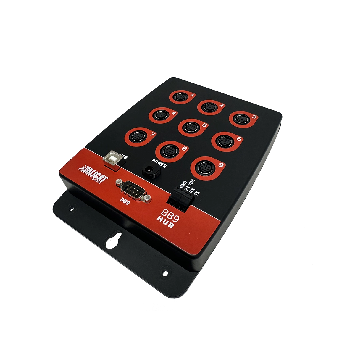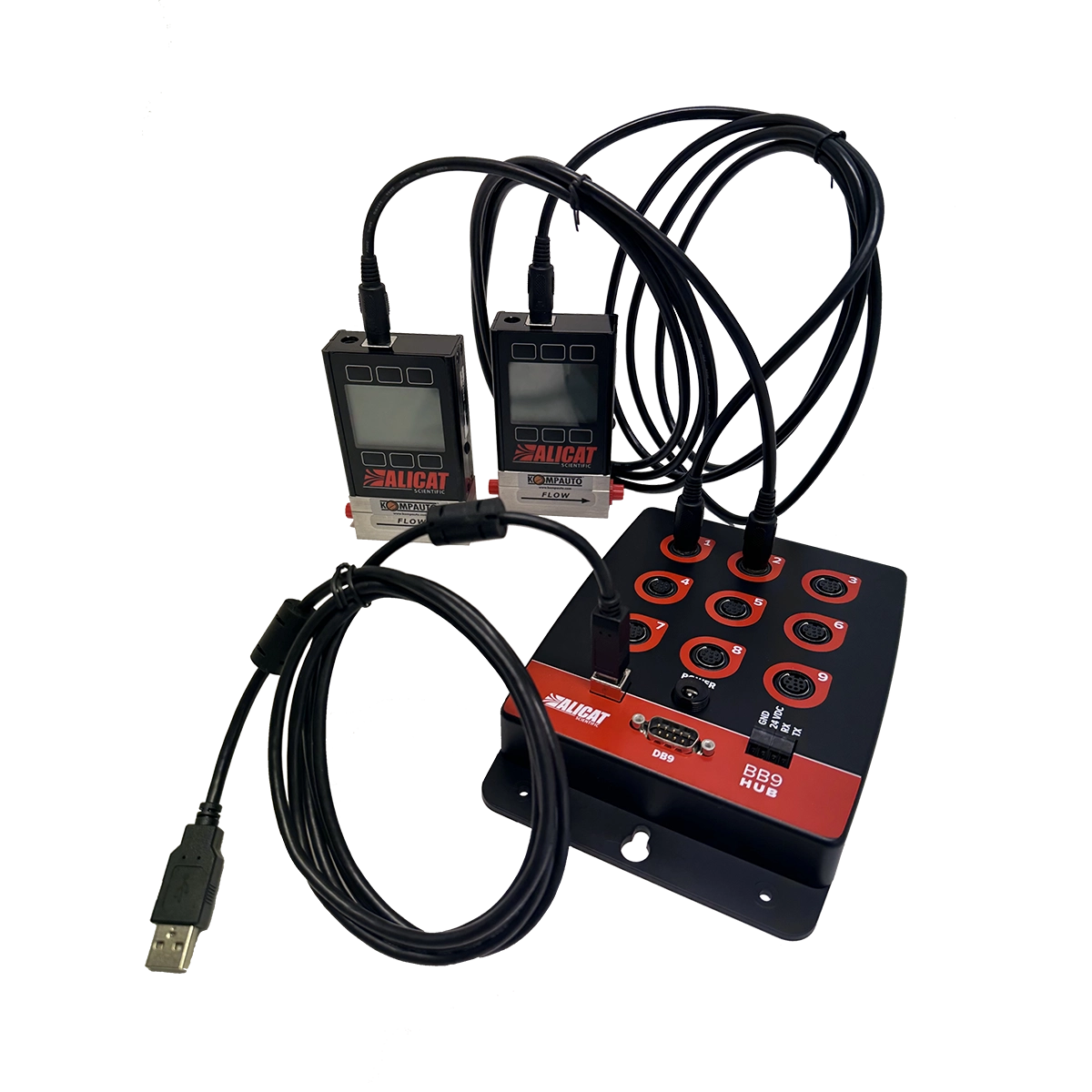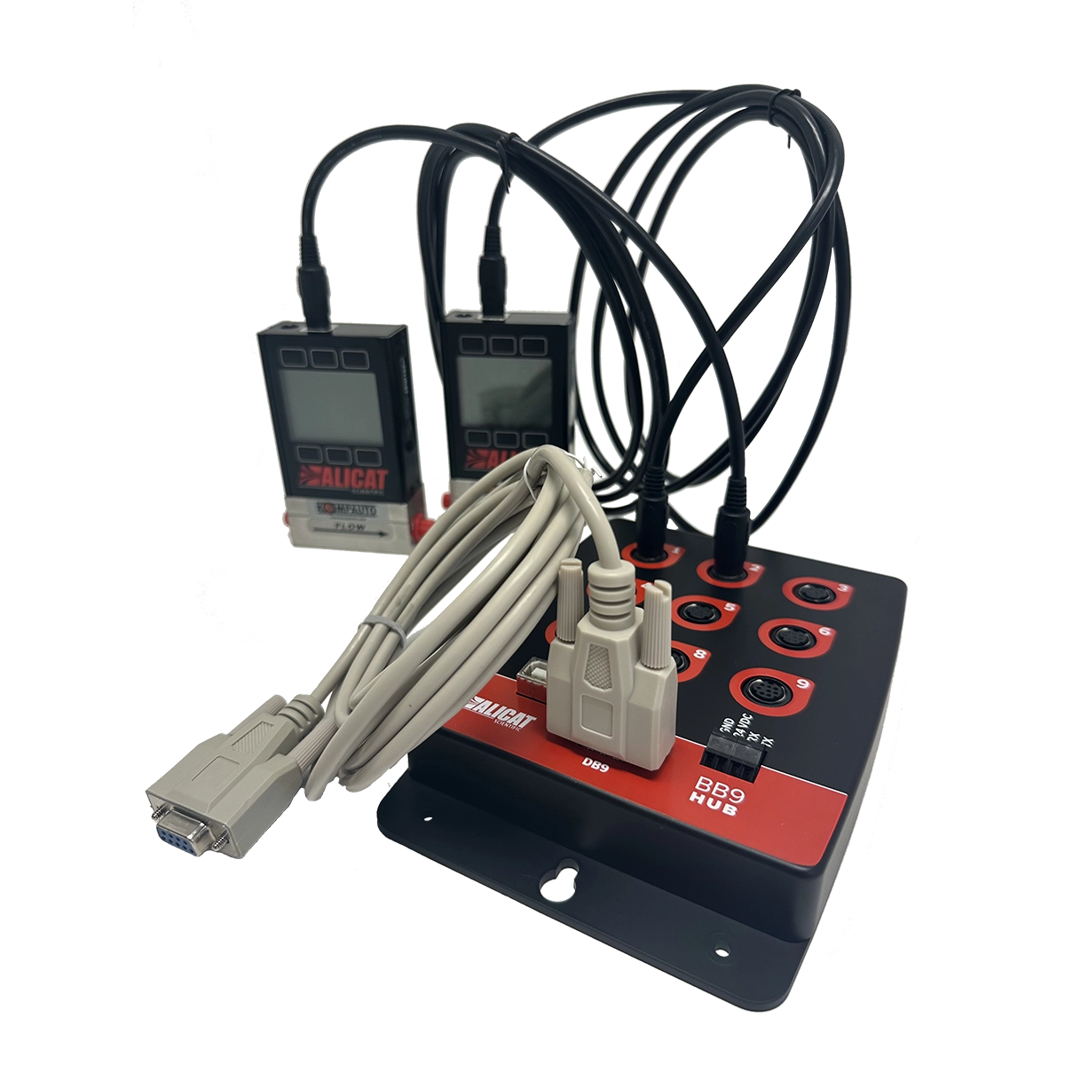 Bruk BB3- og BB9-multidrop-utbryterboksene til å drive og styre opptil 9 Alicat-strømnings- eller trykkinstrumenter med én enkelt strømkilde og en kabel til en datamaskin eller PLS.
